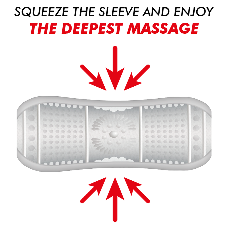 - Pour des sensations plus intenses, pressez le manchon de masturbation.