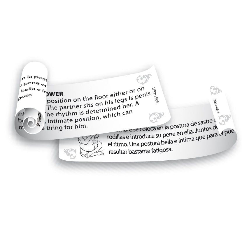 Une sensation unique à partager avec votre partenaire ! À l’aide d’une pince, choisissez un parchemin au cœur de votre choix. Quelle position érotique allez-vous essayer ? La chevauchée de la déesse, le bateau d’amour ou l’adoration ? Relevez le défi et vivez ensemble plaisir et intimité.